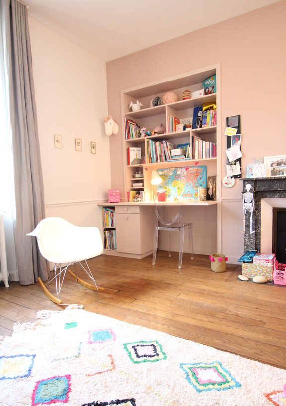 et toute la place nécessaire pour travailler et laisser s'exprimer son esprit créatif. Un vieux rose très doux a été choisi pour habiller le mur et intégrer ce nouveau meuble qui se fond avec